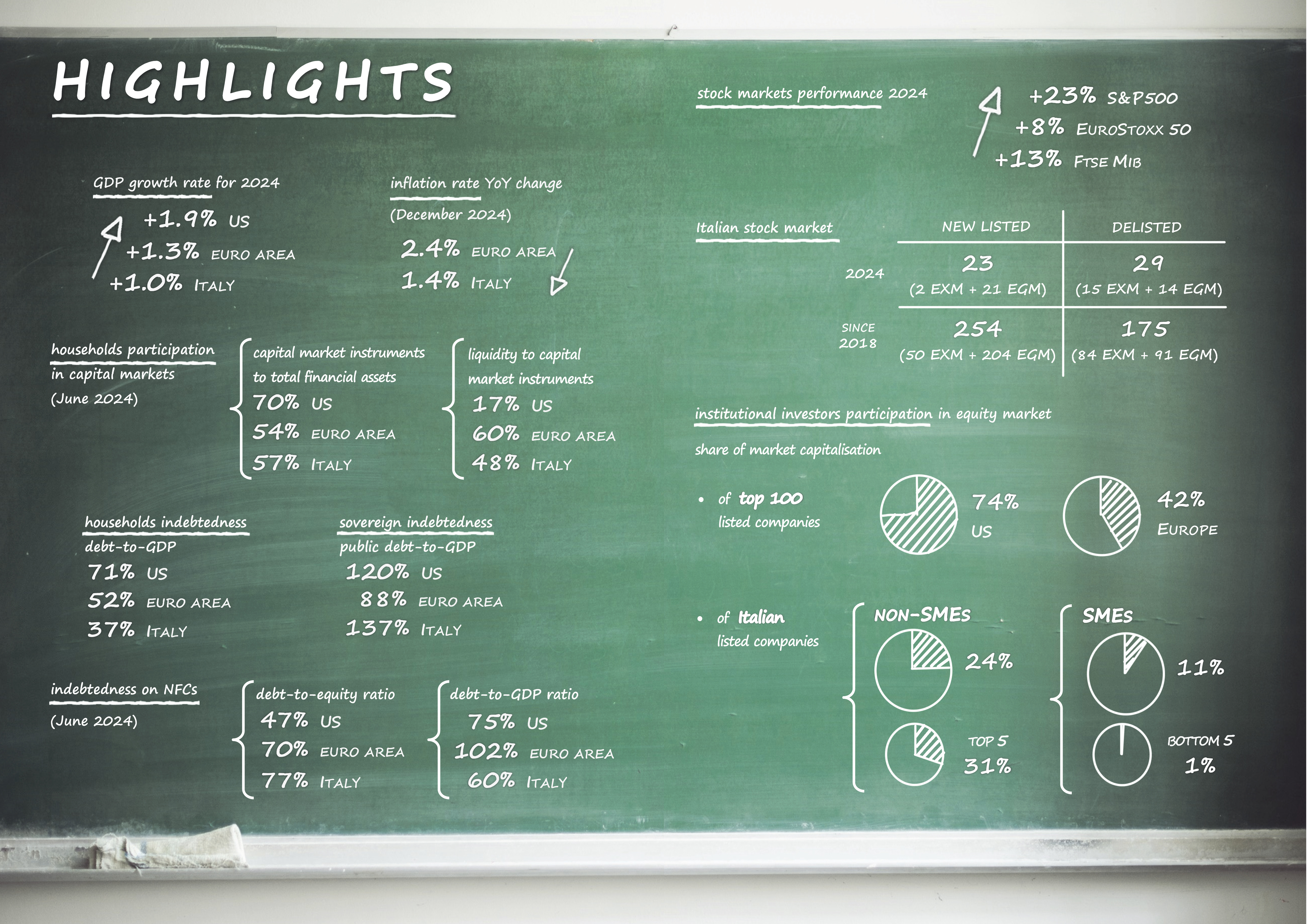 The Report is structured in four sections, each dealing with a specific topic, developed on the basis of the analyses in the Appendix that accompanies the document. Section 1 illustrates the current economic context characterised by the persistence of uncertainties linked to both geopolitical tensions and the weak economic growth affecting the euro area countries; in section 2 a comparative analysis of the size and characteristics of the Italian and European capital markets in the international landscape is proposed, showing data and insights on the degree of participation in capital markets by institutional and retail investors; section 3 examines public and private sector debt levels and future prospects in a context of higher interest rates compared to the historically low levels of the decade prior to 2022 and still rather subdued productivity conditions; section 4 analyses the strong performance of the secondary market in 2024 and proposes useful indicators to assess conditions of liquidity, volatility and interconnectedness between markets. The Appendix contains a comprehensive set of additional analyses, organised into seven sections: macroeconomic landscape; equity markets; bond markets; non-financial corporations; banks; households; mutual funds.